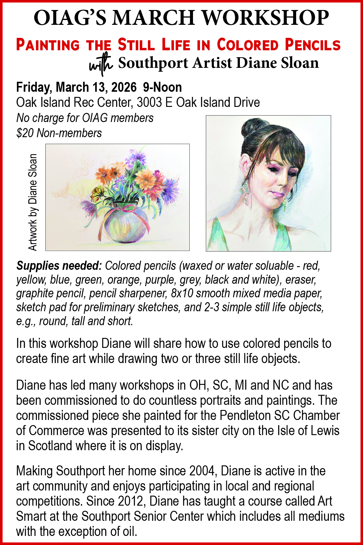 Workshops are held at the Oak Island Recreation Center, 3003 East Oak Island Drive, Oak Island, NC. They follow our 9 am guild meeting and last about 4 hours. Anyone 18 and above is welcome. There is a $40 charge for non-members to cover the cost of the demonstration. Check the monthly listing at this website for featured art and supply list. Join the guild for $40 a year and receive all notifications and other advantages.
